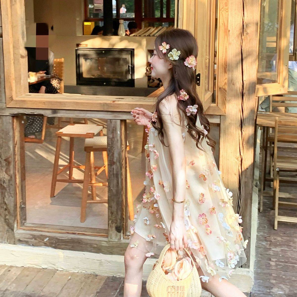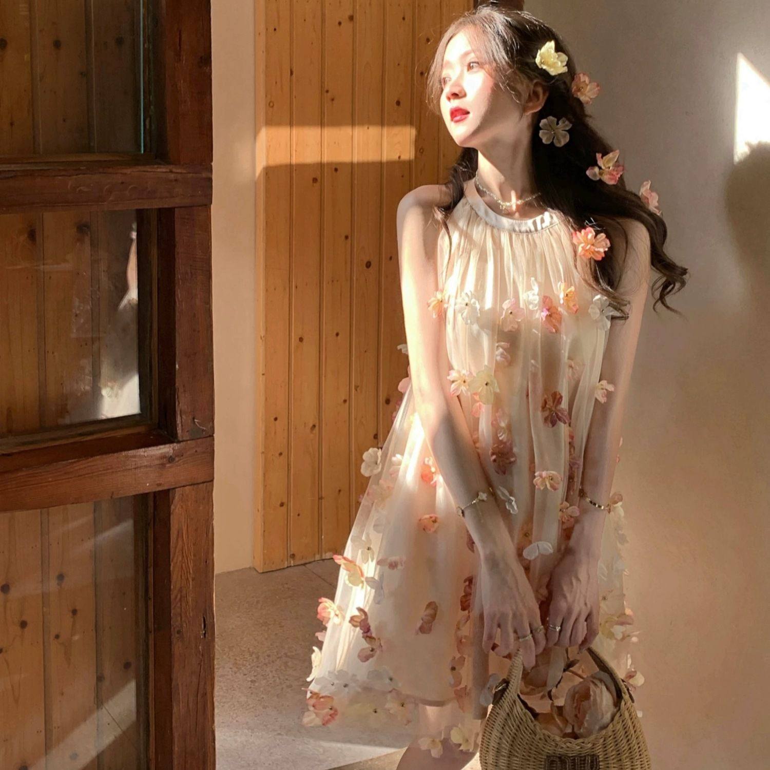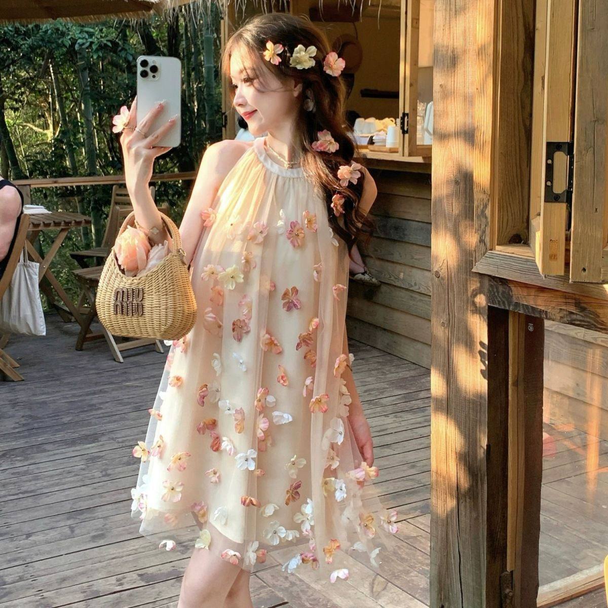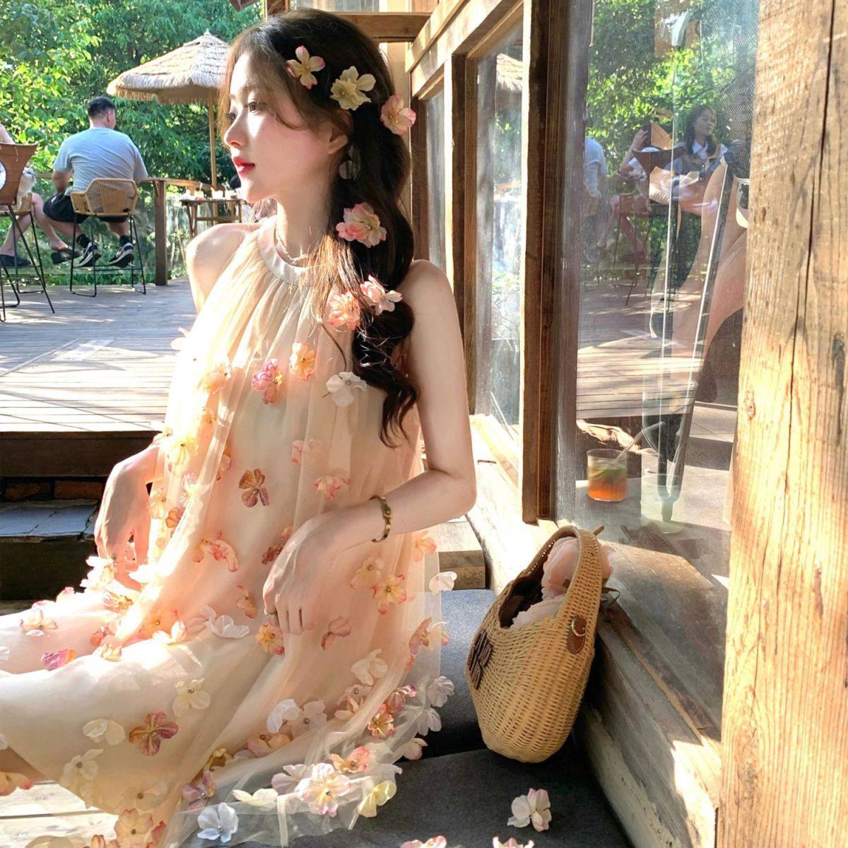 法式绝美超火仙女挂脖长裙夏季甜美氛围感立体花朵
